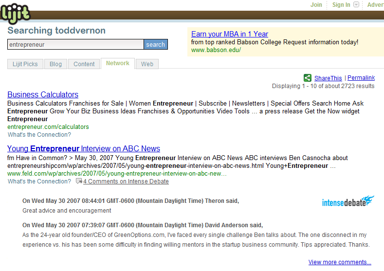 We’re happy to report that Lijit has continued to help IntenseDebate with our mission to help bring your comments into the light. Now when you search using the Lijit search widget, you will see the number of comments along with the first couple of comments on the post brought up in the search results!